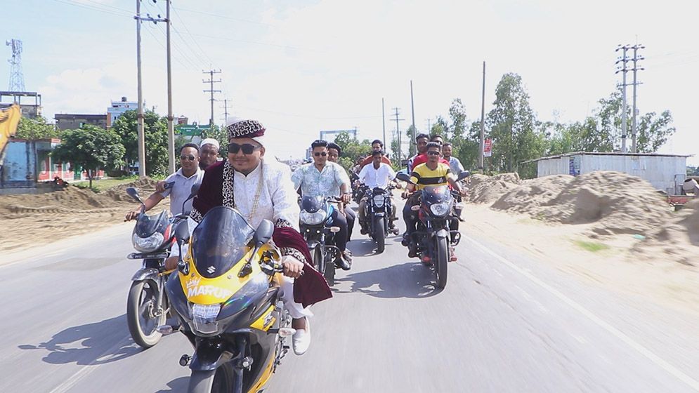 মোটরসাইকেল ও গাড়িবহর নিয়ে বর ছনি চৌধুরী নিজে বাইক চালিয়ে যাওয়ার সময় উৎসুক মানুষের নজর কাড়ে।