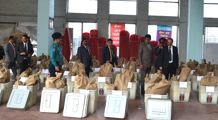 জয়পুরহাটের ২ আসনে ১৫১টি কেন্দ্রে ভোটের সামগ্রী পুলিশ আনসারদের সামনে প্রিজাইডিং অফিসার ও পোলিং অফিসারদের নিকট বুঝিয়ে দেয়া হচ্ছে। সরঞ্জামগুলো গার্ড দিয়ে নিয়ে যাওয়া হবে বলে জানিয়েছেন জেলা নির্বাচন অফিসার মাহমুদুল হাসান।